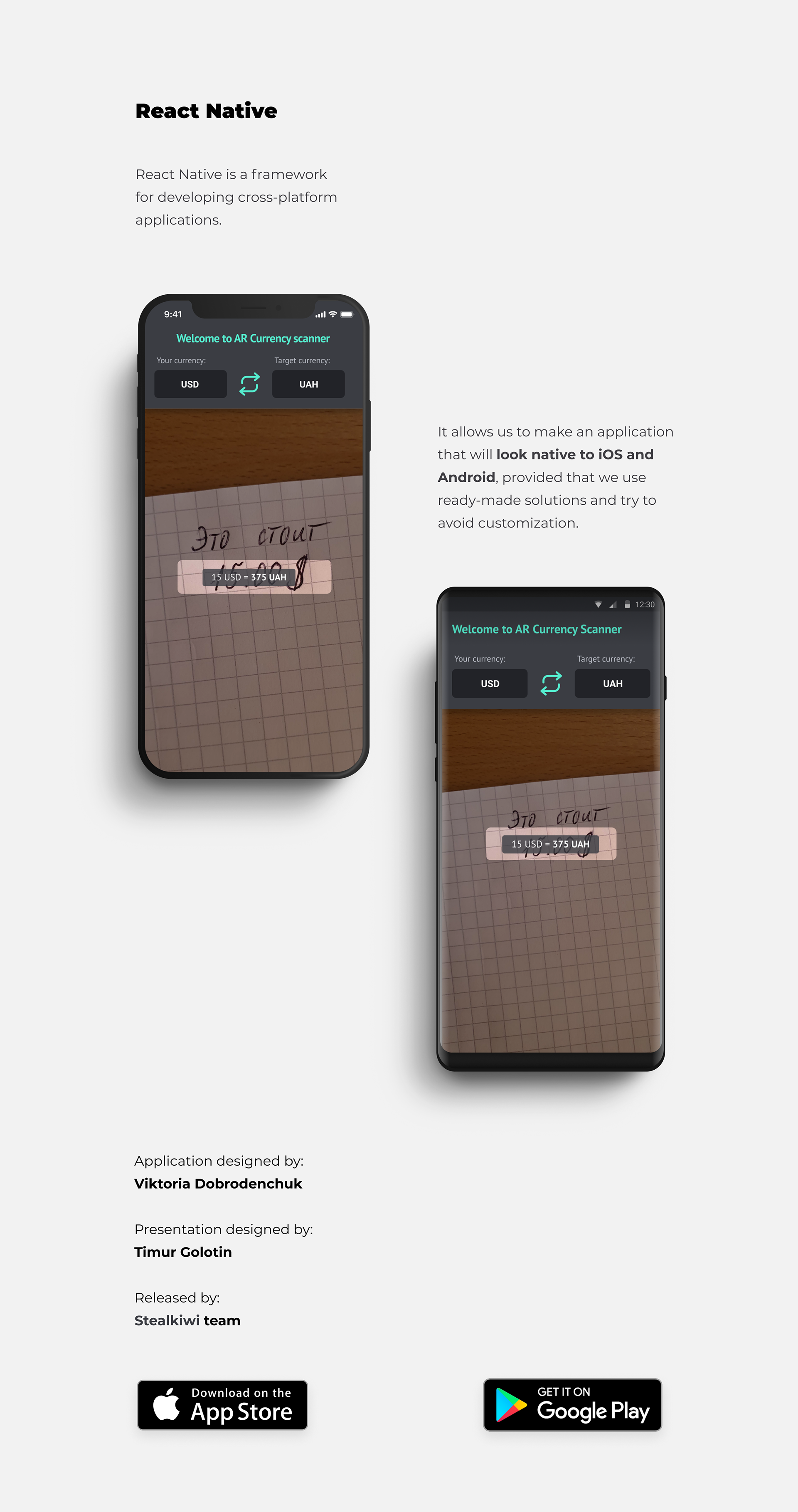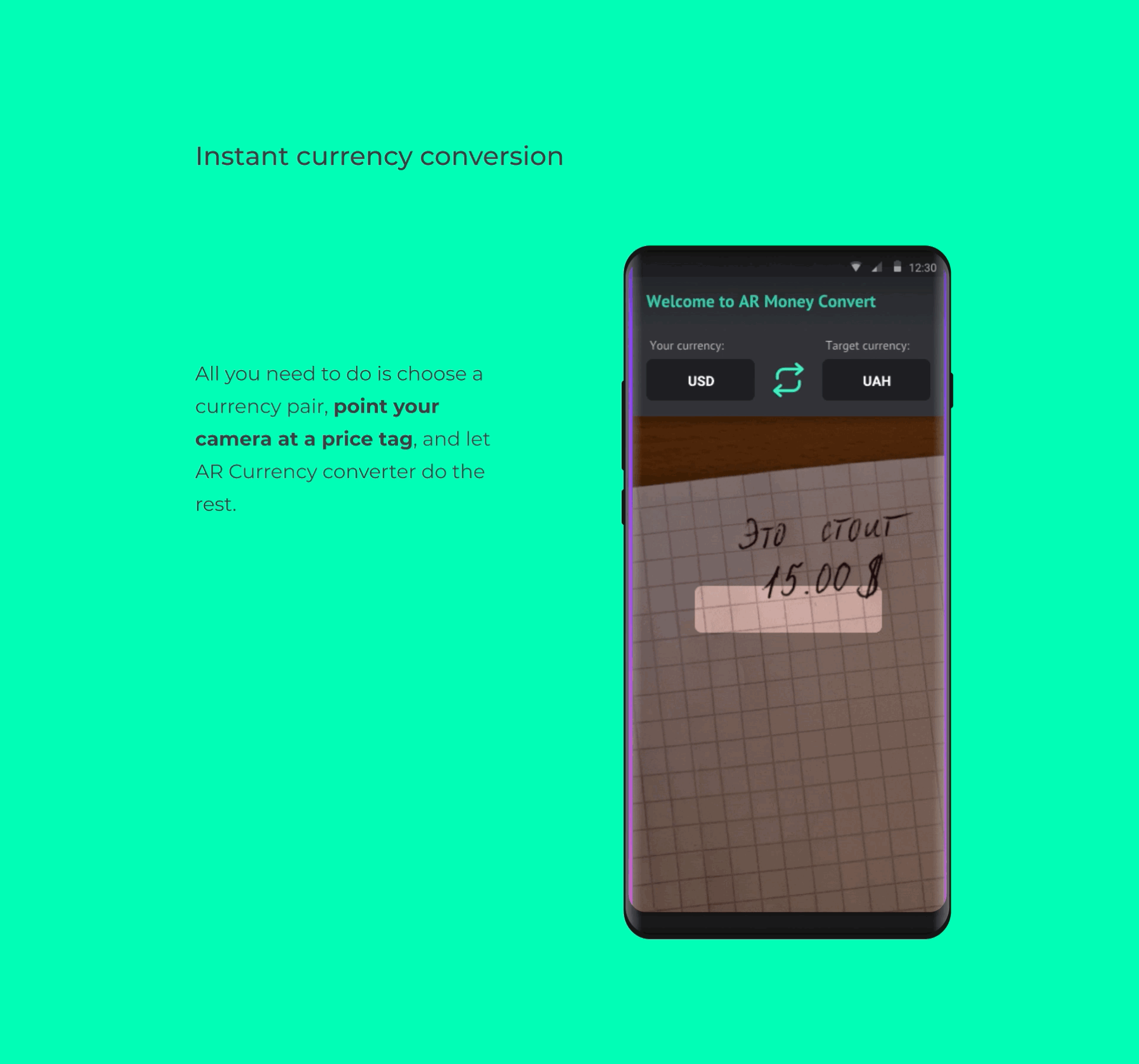 "AR Currency Converter" allows you to convert any price tag through the camera. It was designed for React Native implementation. App is published in both stores.